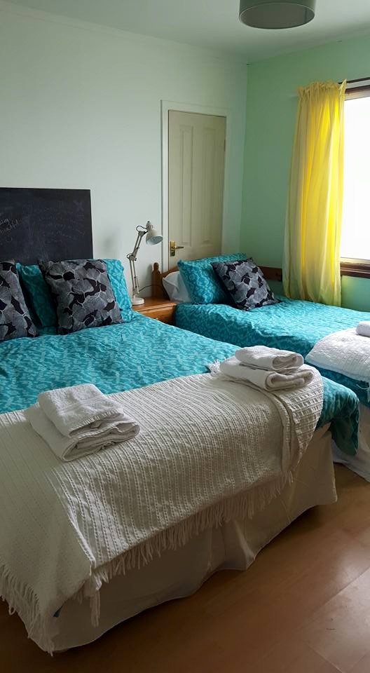 I have two rooms available a family room with double and single (sleeps three) and a double room (sleeps two) The rooms have a shared bathroom and use of the lounge with a view of the loch and macleod tables and a wide selection of games and books, and a wood-burning fire. There is a microwave for your use in the dining area. Breakfast consists of porridge, toast, croissants, fruit juice, fresh coffee, tea, fruit, yoghurt and jams. Simple but substantial and perfect to keep up the energy for a long cycle.